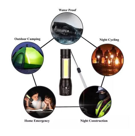 Linterna LED de bolsillo que cabe en la palma de la mano pero que posee una potente luz con zoom, viene con luz adicional en el cuerpo de la linterna que es ideal para lectura con poca luz, supervivencia, campamento y demás actividades al aire libre.